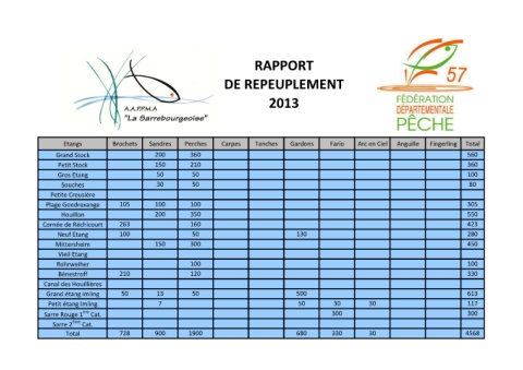 Etangs Grand Stock Petit Stock Gros Etang Souches Souches Petite Creusière Plage Gondrexange Houillon Cornée de Réchicourt Neuf Etang Mittersheim Vieil Etang Rohrweiher Bénestroff Canal des Houillières Grand étang imling Petit étang Imling Sarre Rouge 1 ère Cat. Sarre 2 ème Cat. Total