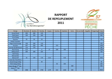 Etangs Grand Stock Petit Stock Gros Etang Souches Souches Petite Creusière Plage Gondrexange Houillon Cornée de Réchicourt Neuf Etang Mittersheim Vieil Etang Rohrweiher Bénestroff Canal des Houillières Grand étang imling Petit étang Imling Sarre Rouge 1 ère Cat. Sarre 2 ème Cat. Total