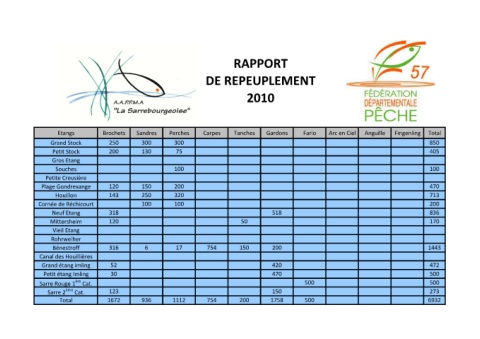 Etangs Grand Stock Petit Stock Gros Etang Souches Souches Petite Creusière Plage Gondrexange Houillon Cornée de Réchicourt Neuf Etang Mittersheim Vieil Etang Rohrweiher Bénestroff Canal des Houillières Grand étang imling Petit étang Imling Sarre Rouge 1 ère Cat. Sarre 2 ème Cat. Total
