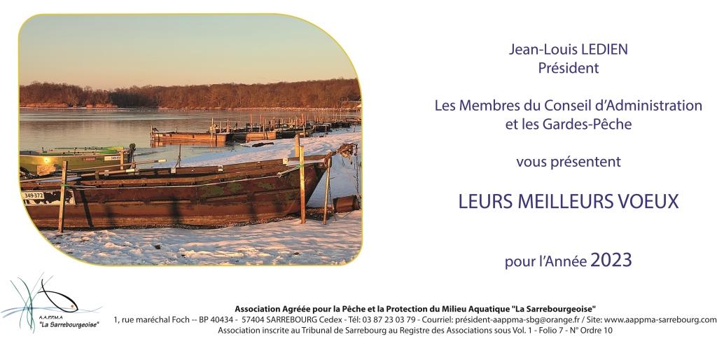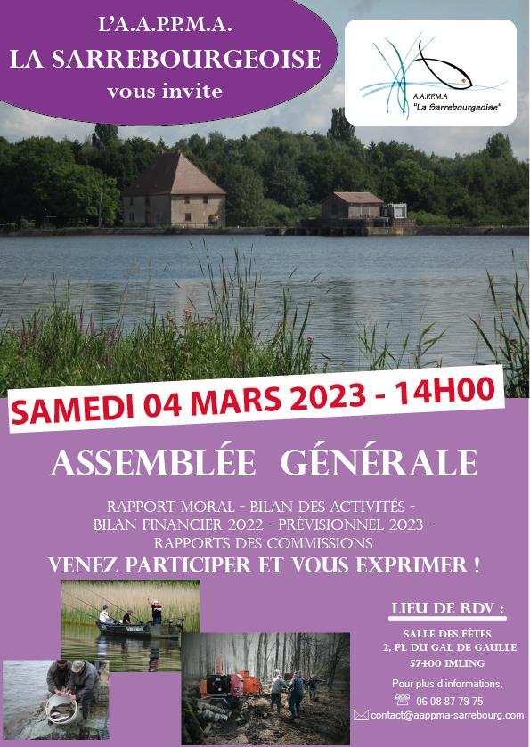l’association tiendra son assemblée générale annuelle le 4 mars à 14 h. Avec deux changements notables : le premier sera qu’elle se déroulera un samedi, et non un dimanche comme les fois précédentes. Ensuite, l’assemblée générale n’aura pas lieu à Sarrebourg, mais à Imling, à la salle des fêtes (2, place du Général-de-Gaulle). L’ordre du jour comprendra le rapport moral, le bilan de la saison de pêche, le bilan financier, les bilans divers et des débats.